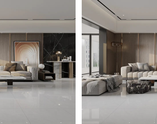 溫馨舒適的原木色,如同冬日暖陽,悄然無聲潛入室內,搭配800X800mm規格的雷恩灰,34°以上的超白坯體,90°的透亮光感,在斑斕的光影中映射著天然石紋的形狀,溫柔細膩,讓人沉溺其中。